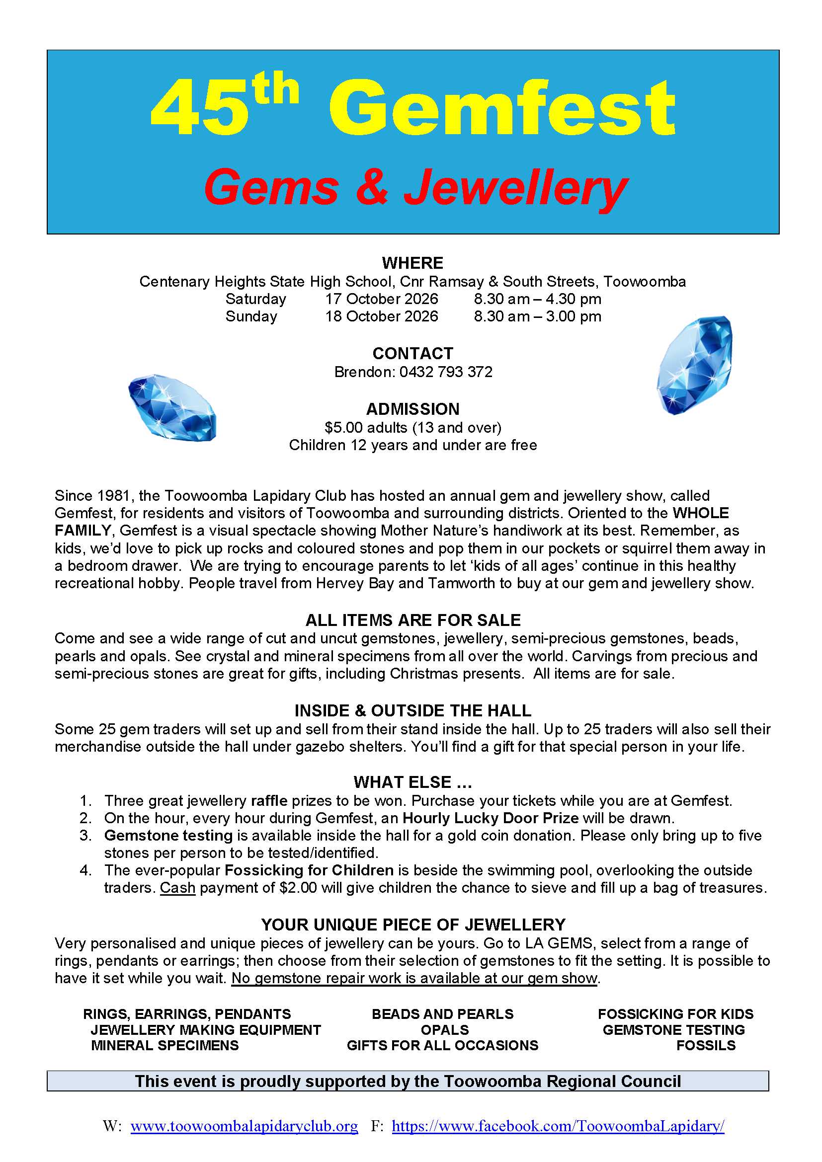 GEMFEST – Gems & Jewellery is hosted by the Toowoomba Lapidary Club as a Toowoomba event for the public and visitors to attend.